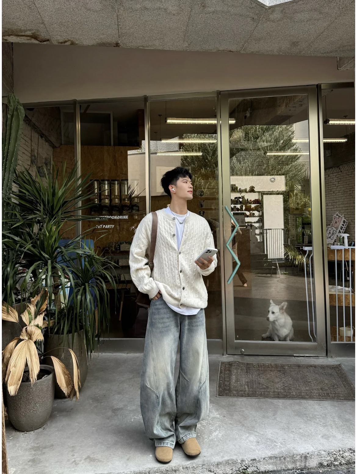 选择白色基础款 T 恤,简约干净,为整体穿搭奠定清爽基调,同时作为中间层,增强视觉层次。搭配米白色麻花针织开衫,针织纹理自带复古质感,宽松的版型兼具休闲感与慵懒氛围,纽扣设计方便穿脱,也可根据温度调节穿搭方式