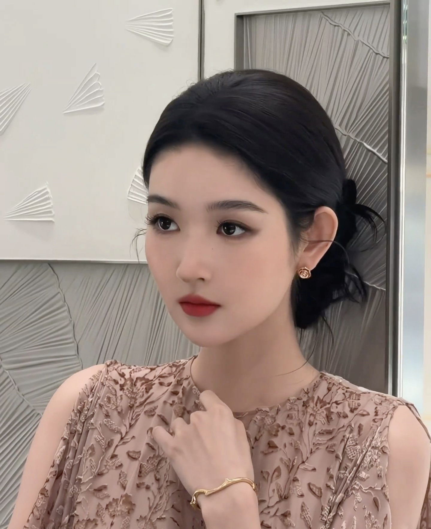发型则是低盘发造型,将头发整齐地向后梳理,盘成一个慵懒却不失精致的发髻,几缕碎发自然垂落,既利落大气,又增添了一丝柔和感,完美凸显出她的天鹅颈和精致五官,把东方女性的端庄与柔美平衡得恰到好处。配饰上,选择了迪奥经典的玫瑰金耳饰,小巧的玫瑰造型精致别致,与整体妆造相得益彰,于细节处彰显品牌奢雅格调。