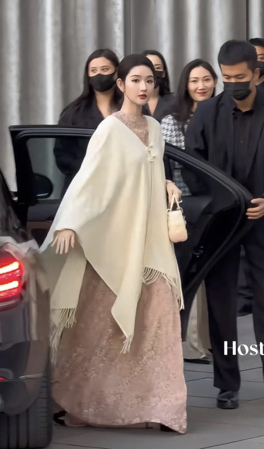 外搭的米白色羊绒披肩是点睛之笔,流苏设计增添了灵动韵律,披肩的版型宽松大气,既有中式披风的飘逸感,又融合了法式羊绒单品的奢华质感,两颗珍珠扣点缀其间,精致度拉满。手持的浅粉色迷你手袋,与整体色调和谐统一,小巧的廓形尽显精致感,是造型的 “奢雅彩蛋”。