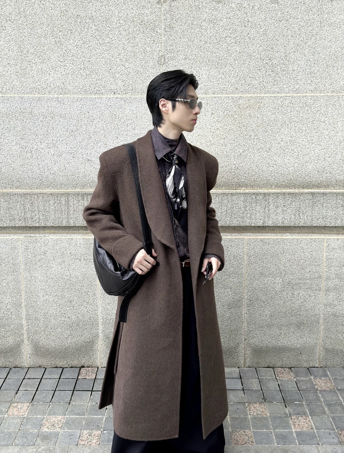 就像图里这位,一件深棕色长款羊毛大衣往身上一裹,松弛感和贵气感直接拉满。大衣选对了,整个人的气场都会跟着往上走:不用刻意凹造型,随便往墙边一站,就自带 “都市贵公子” 的氛围感。