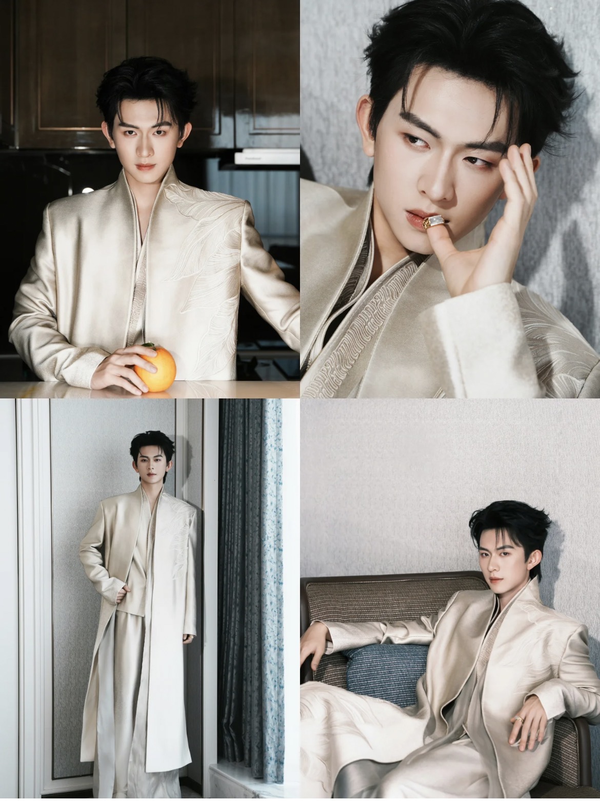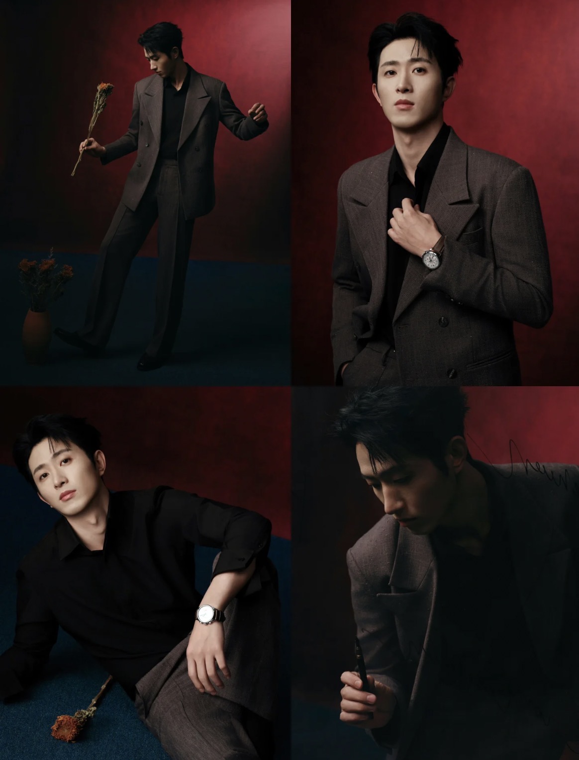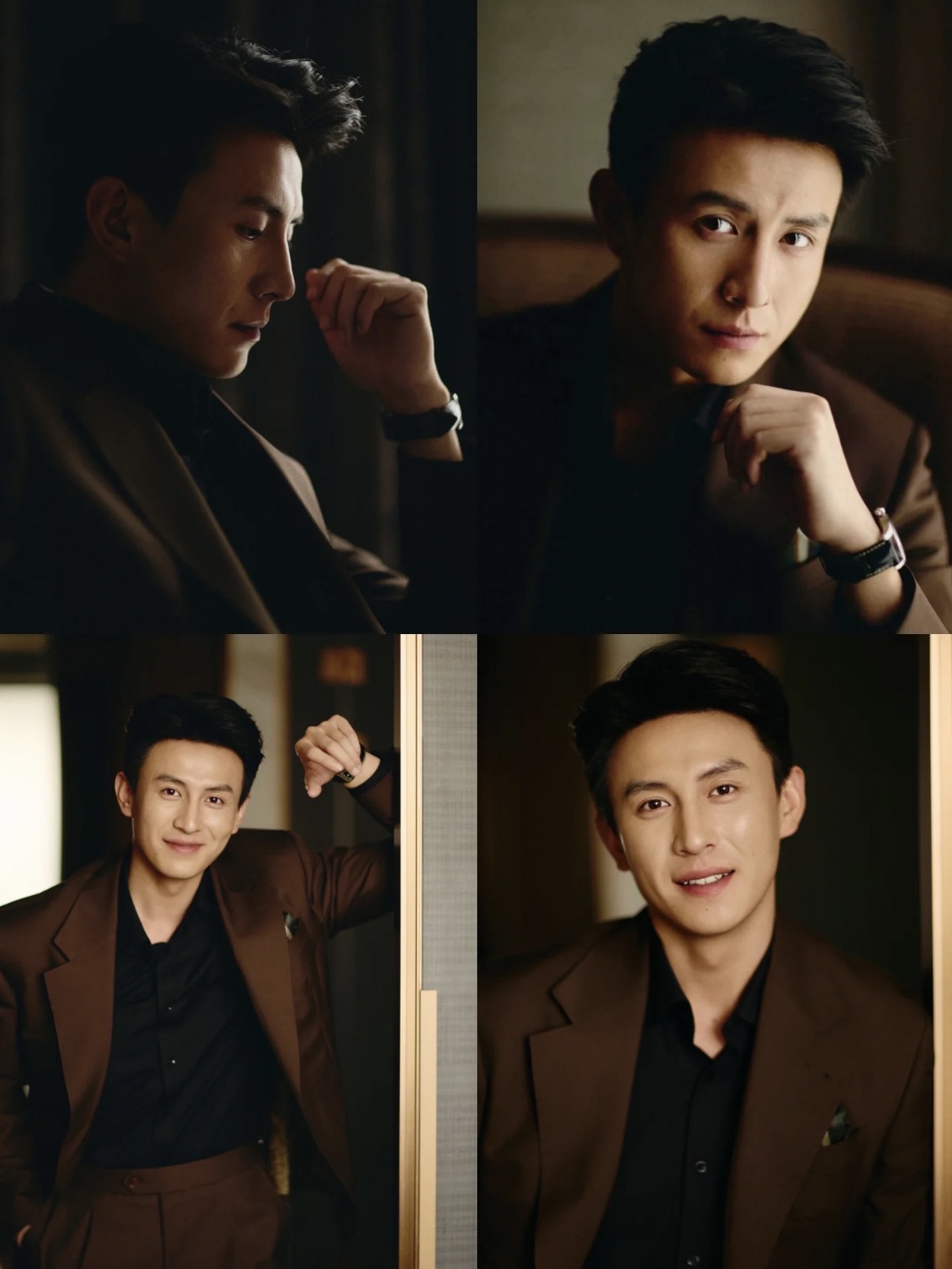 男演员刘萧旭,陈添祥,王凯沐等阵营主打 “贵气松弛感”:左侧深色西装搭配黑衬衫,腕表点缀出精英气场,眉骨处的哑光修容强化了冷感轮廓;右侧深棕西装内搭同色系衬衫,领口微敞自带慵懒,唇色选了低饱和裸棕,削弱攻击性的同时保留了少年感。中间米色系西装叠搭丝巾,雾面底妆衬得皮肤清透,眼尾轻扫的暖调眼影,让冷硬骨相多了几分柔和。