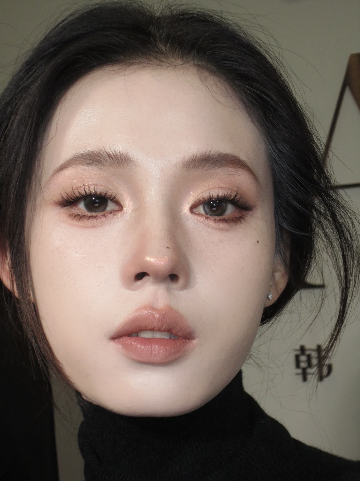 眼妆是暖调奶茶色打底 + 细闪提亮,搭配长而不夸张的仙子毛,放大眼睛但不浓艳;