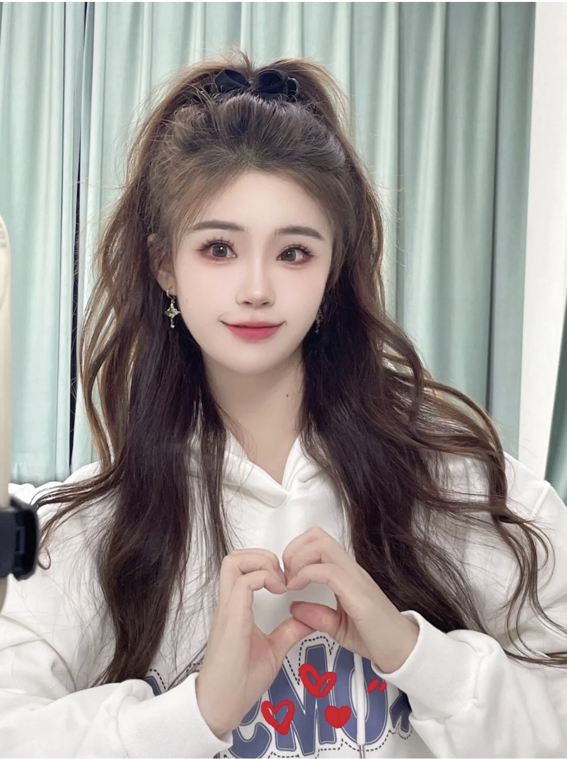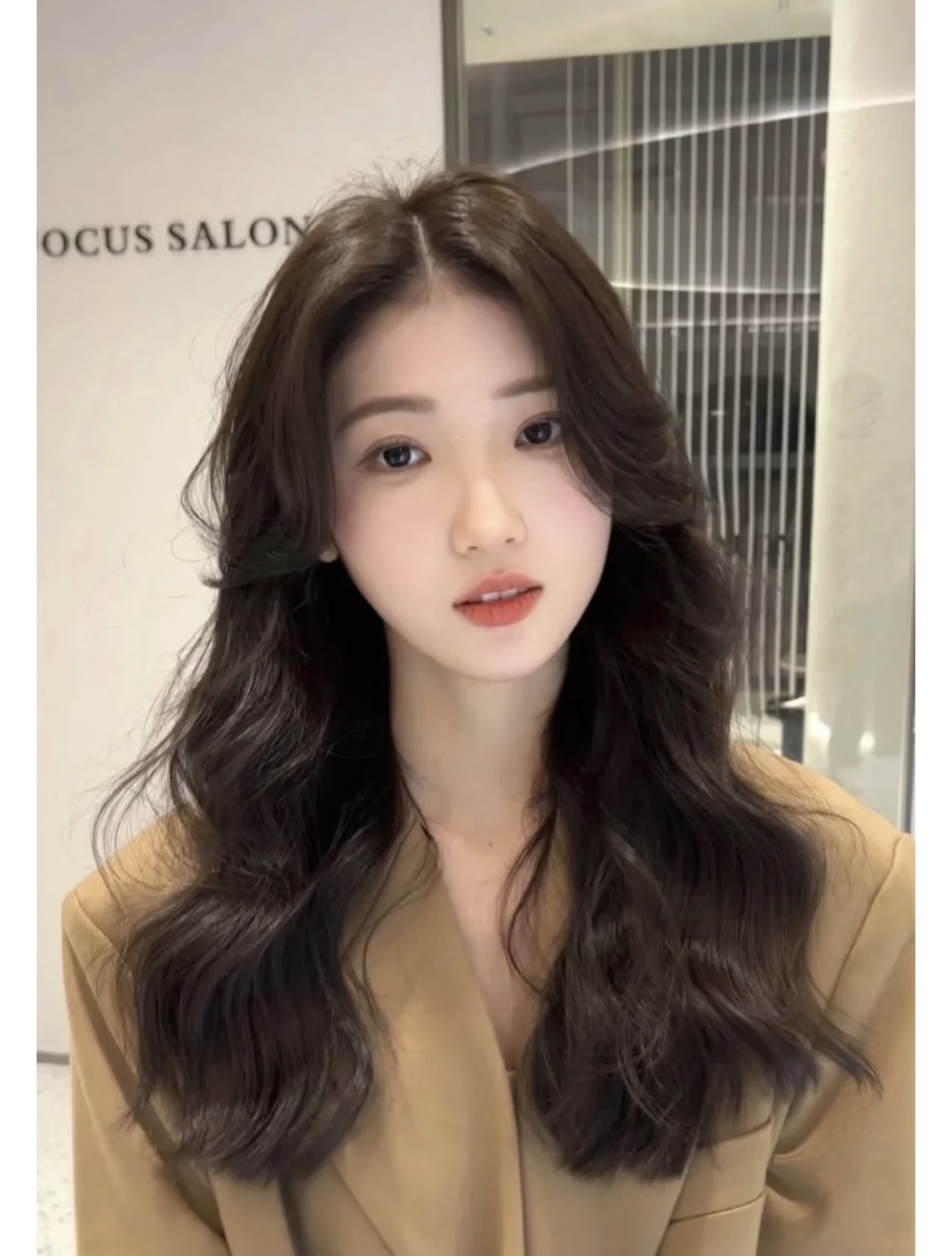 长发本身有纵向延伸效果,搭配从颧骨位置开始的大波浪,能修饰脸部最宽的位置。长刘海(S型刘海或八字刘海)可以完美遮挡脸颊肉肉。